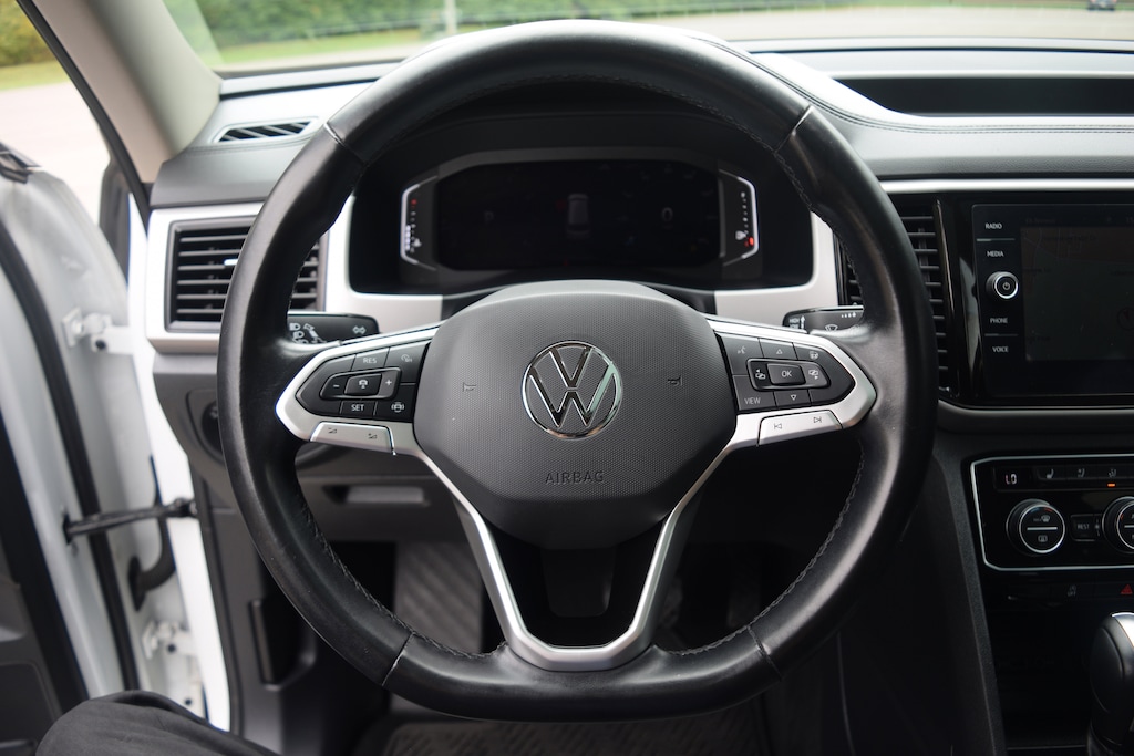 THIS CAR ALSO INCLUDES THE FOLLOWING FEATURES AND OPTIONS:12 Speakers, 3.60 Axle Ratio, 3rd row seats: split-bench, 4-Wheel Disc Brakes, ABS brakes, Air Conditioning, Alloy wheels, Auto High-beam Headlights, Auto-dimming Rear-View mirror, Automatic temperature control, Brake assist, Bumpers: body-color, Compass, Delay-off headlights, Driver door bin, Driver vanity mirror, Dual front impact airbags, Dual front side impact airbags, Electronic Stability Control, Emergency communication system: VW Car-Net services (capabilities require enrollment or subscription), Four wheel independent suspension, Front anti-roll bar, Front Bucket Seats, Front Center Armrest, Front dual zone A/C, Front fog lights, Front reading lights, Fully automatic headlights, Heated door mirrors, Heated front seats, Heated rear seats, Heated steering wheel, Htd/Actively Ventilated Comfort Front Sport Seats, Illuminated entry, Leather Shift Knob, Low tire pressure warning, Memory seat, Navigation System, Occupant sensing airbag, Outside temperature display, Overhead airbag, Overhead console, Panic alarm, Passenger door bin, Passenger vanity mirror, Perforated Vienna Leather Seating Surfaces, Power door mirrors, Power driver seat, Power Liftgate, Power moonroof, Power passenger seat, Power steering, Power windows, Radio data system, Rain sensing wipers, Rear air conditioning, Rear anti-roll bar, Rear audio controls, Rear reading lights, Rear seat center armrest, Rear window defroster, Rear window wiper, Remote keyless entry, Roof rack: rails only, Security system, Speed control, Speed-sensing steering, Split folding rear seat, Spoiler, Standard Suspension, Steering wheel mounted audio controls, Tachometer, Telescoping steering wheel, Tilt steering wheel, Traction control, Trip computer, Turn signal indicator mirrors, Variably intermittent wipers, Ventilated front seats, and Wheels: 20 5-Spoke 2-Tone Machined Alloy.